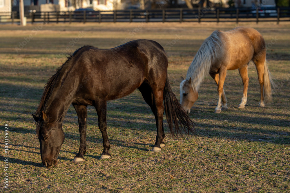 Horses grazing in a sunlit meadow. A horse standing in a field. A horse peacefully grazing in a green pasture. A herd of horses at the countryside. Beautiful horses enjoying their freedom in nature.
