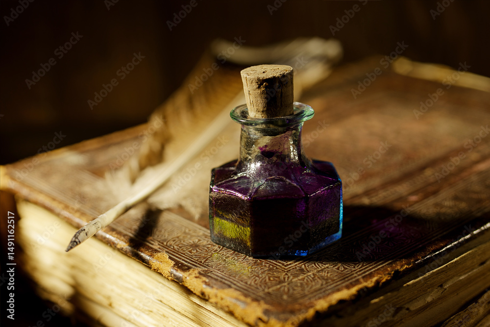 Feather and ink bottle on old antique book. Feather for calligraphy, old education, antique leather-bound book cover with ornament.