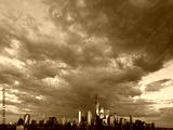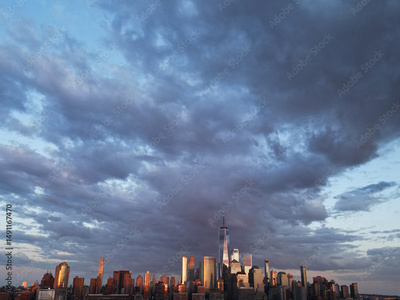 New York City. NYC aerial view, New York City Skyline with dramatic sky. Panoramic drone view on Manhattan in NY. Sunset in NYC. New York City Midtown skyline view at dusk with dark clouds.