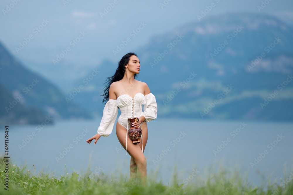 Sexy model, female Farmer with sexy body on hay field in countryside. Rural woman in Swiss, rural Alps. Sensual female farmer in Switzerland countryside landscape nature on grass farm.