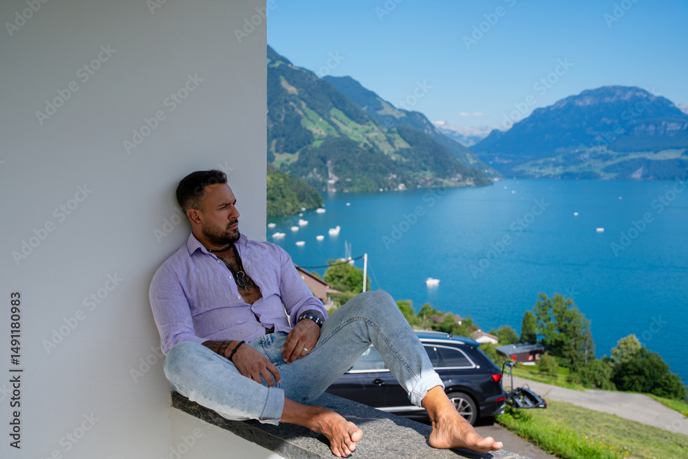 A muscular man relax on mountain Alps landscape. A handsome tourist man on alpine lake. A strong, sexy man posing in summer nature. A dreamy, carefree traveler. Man freedom in the outdoors.