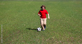 A kid is playing football. A child kicks the soccer ball. Kids sport. Kid football player runs toward goal. Kid kicking football ball. A sporty child enjoys the football. Kids are playing foot ball.