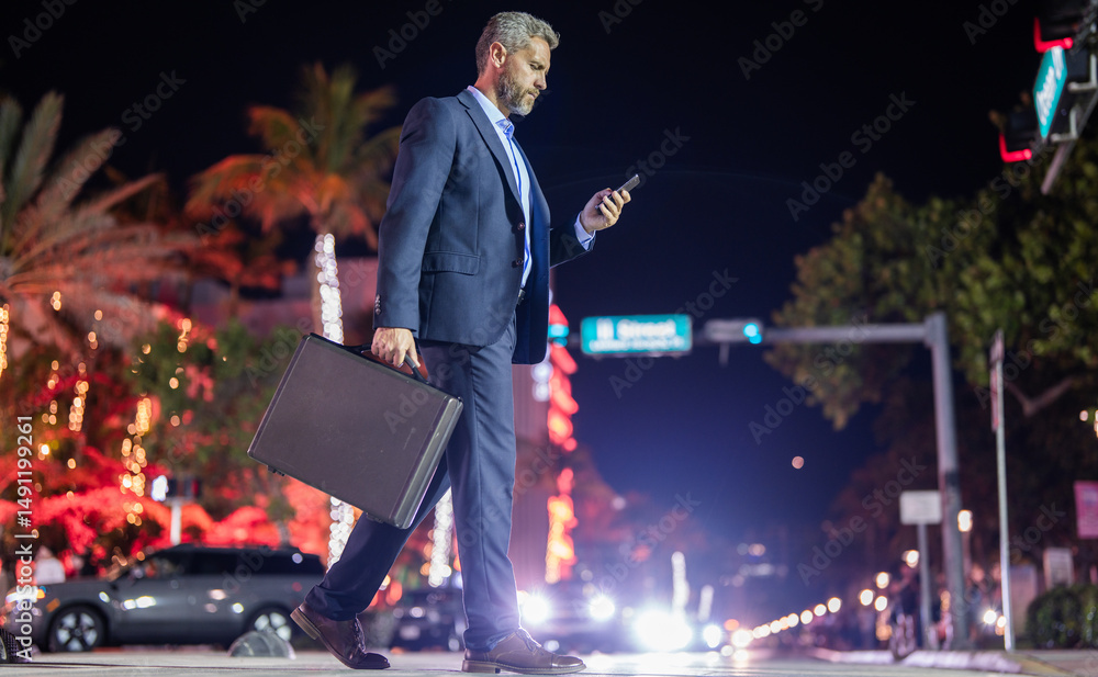 Businessman with briefcase and phone walking at city. Rich man in suit in night. Businessman near luxury car. Businessman walking near night city. Business style. Rich businessman in luxury setting.