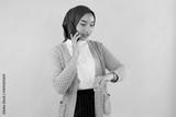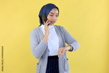 Young Asian Woman with Blue Hijab Talking at the Phone While Looking at Her Watch