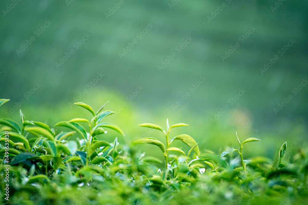 Green tea tree field Garden water hose landscape. Organic farm tender bud herbal Green tea tree in camellia sinensis watering. Close up Fresh Tree tea plantation mountain green nature in herbal farm