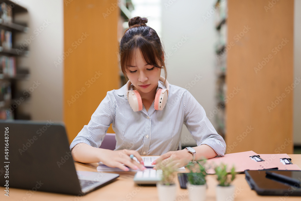 Asian Student Studying at Library Desk with Laptop, Calculator, Book, and Headphones for Educational Research and Academic Success