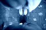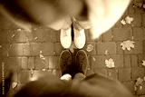 Top view of feet in shoes of a couple in love among autumn fallen leaves