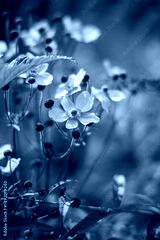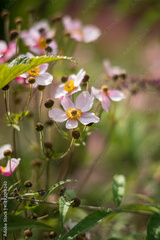 Delicate pink flowers glisten with dew in a lush garden, showcasing nature's beauty at dawn