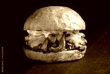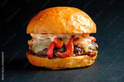 A delicious gourmet burger showcases layers of melted cheese, grilled vegetables, and a toasted bun
