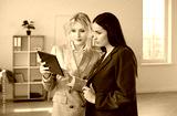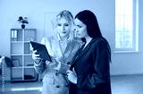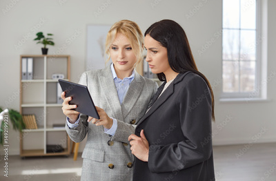 Business owners women, individual female entrepreneur serious businesswomen check data at tablet, count, manage own company finances using computer, doing financial analysis in office standing in hall
