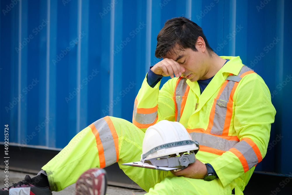 Technician or worker have a headache and feeling tired from work at containers warehouse storage