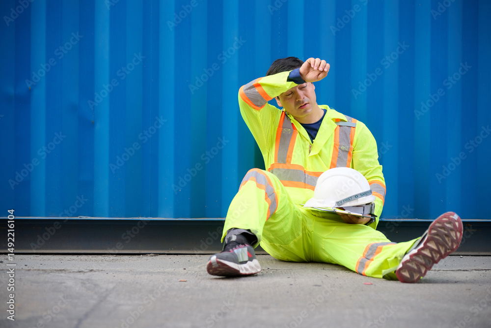 Technician or worker have a headache and feeling tired from work at containers warehouse storage