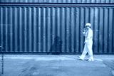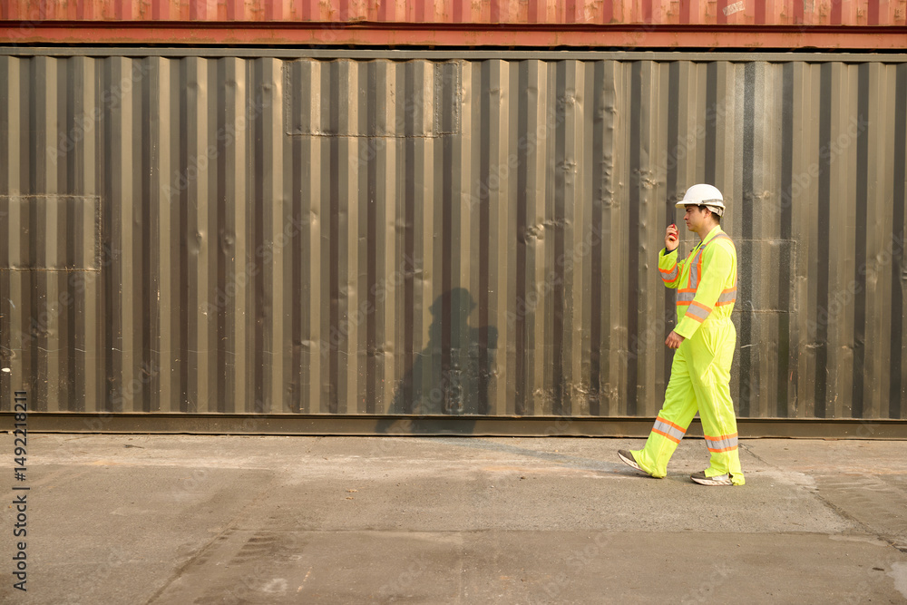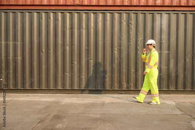 Worker or engineer walking forward and talking on walkie talkie in containers warehouse storage