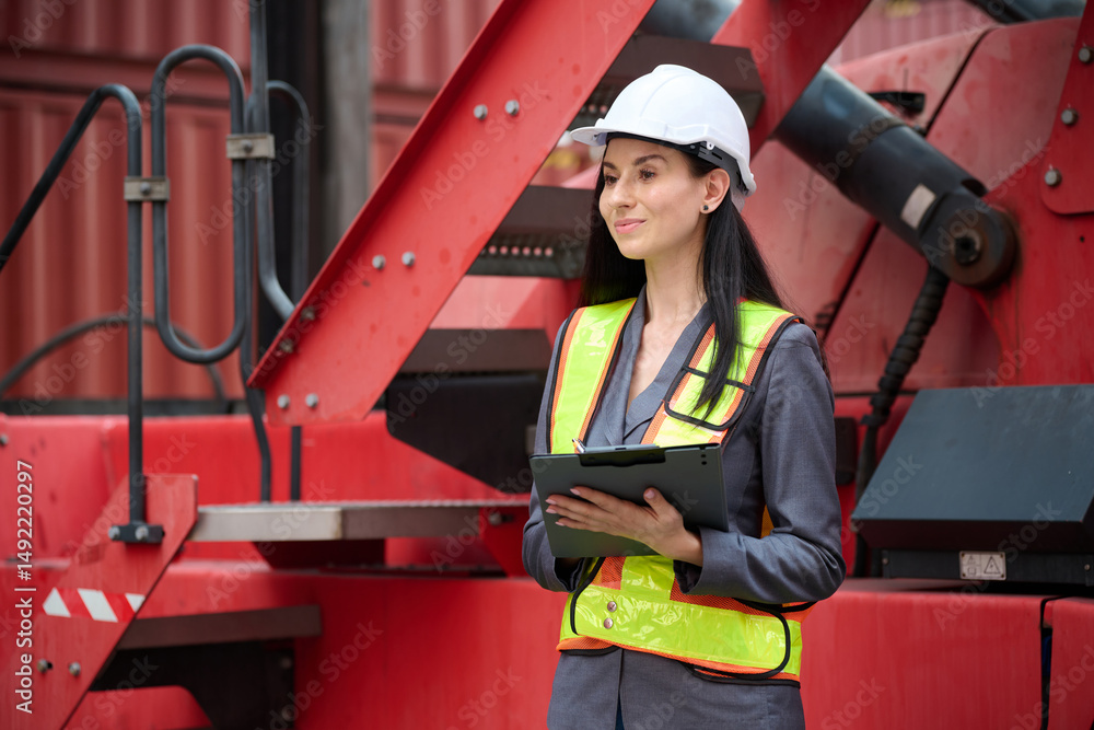 Engineer or worker writing on clipboard and checking containers in warehouse storage