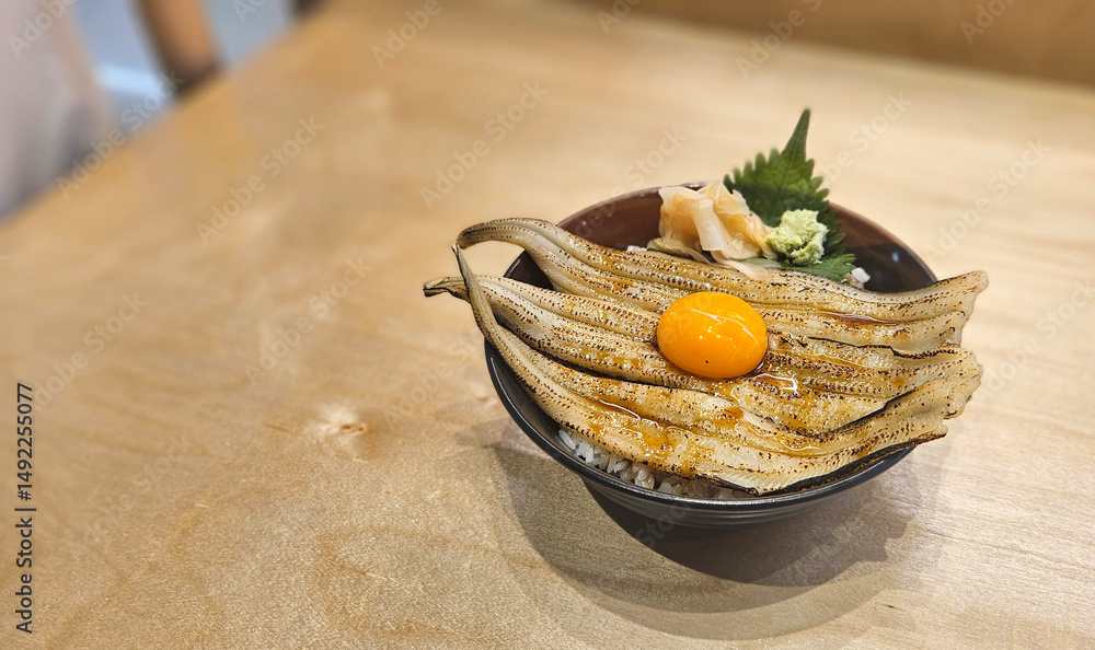 Grilled anago Japanese saltwater eel with raw egg topping with Japanese rice.