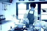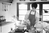 Smiling man in an apron prepares noodles over a stove in warm modern kitchen
