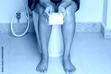 Woman sitting on the toilet bowl in the bathroom. She has stomach ache. Poor digestive system. Constipation. Diarrhea. Food poisoning. Health and medicine.