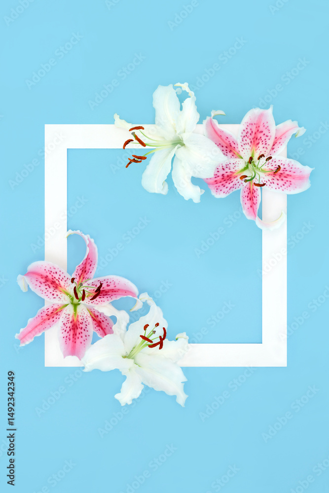 Pink white lily flower spring summer background border on blue, floral white frame design for birthday, anniversary, mothers day, wedding invitation or greeting card.