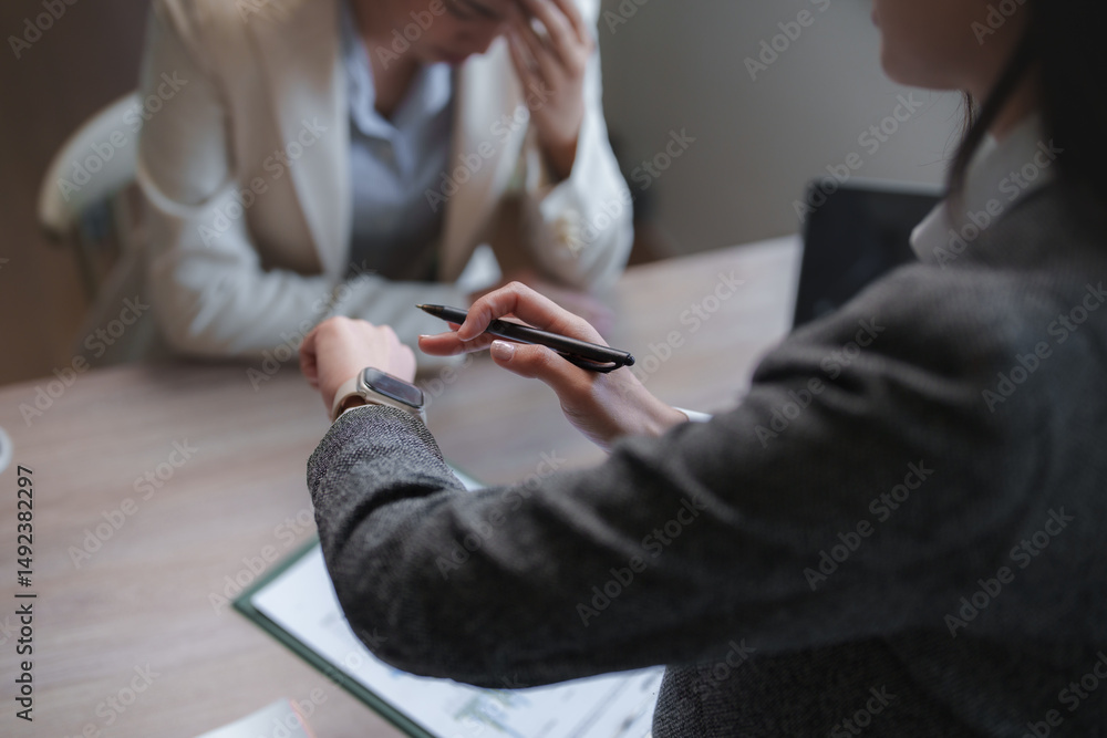 Businesswoman checking time during meeting with sad colleague