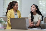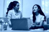 Two young businesswomen discussing work using laptop in office