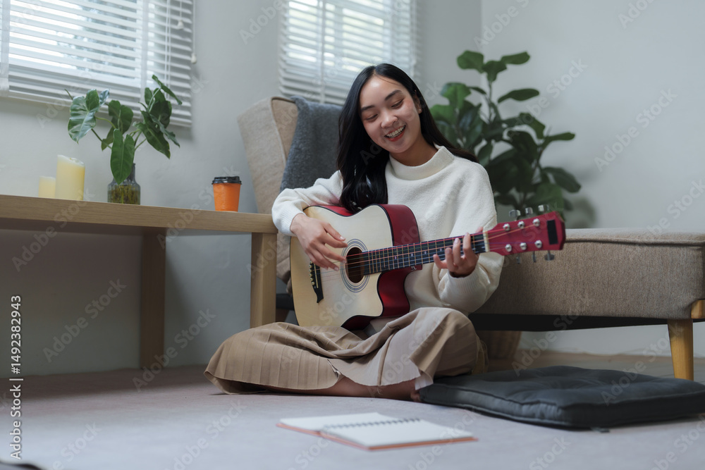 Young asian woman playing acoustic guitar at home