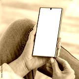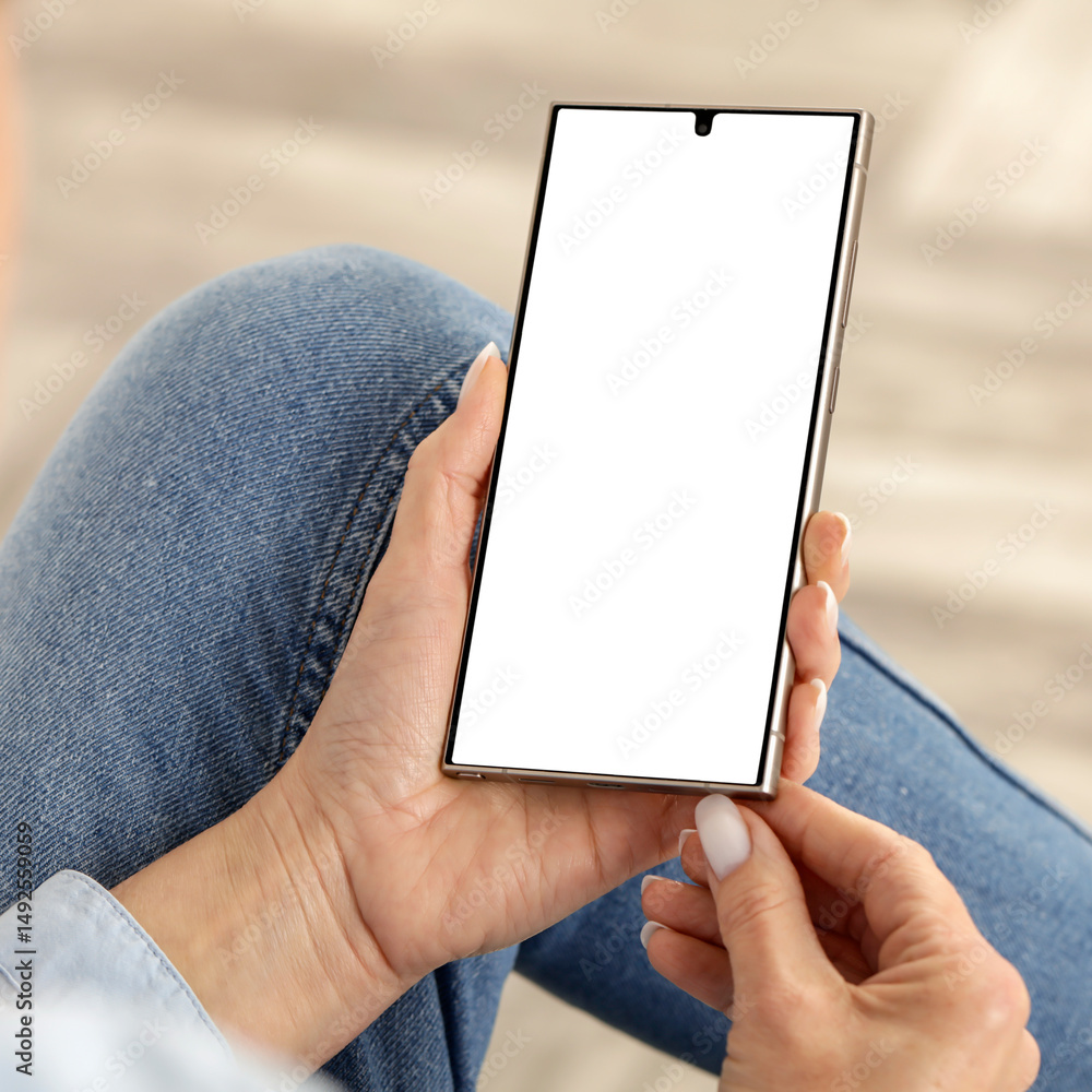 Phone in the hand of a young woman with a blank screen for text. New technology and social media or shopping online concept.