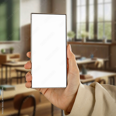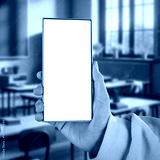 Woman hand with a phone with white screen with copy space in front of blurred school background