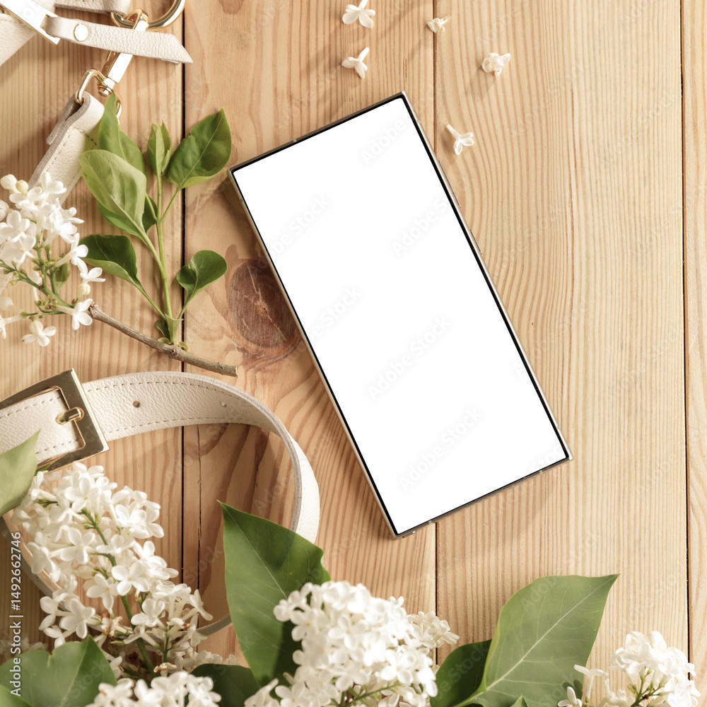 Flat lay of a smartphone on a wooden table with copy space for text or product . Perfect for fashion, cosmetics, lifestyle project designs or product placement themes in natural light.
