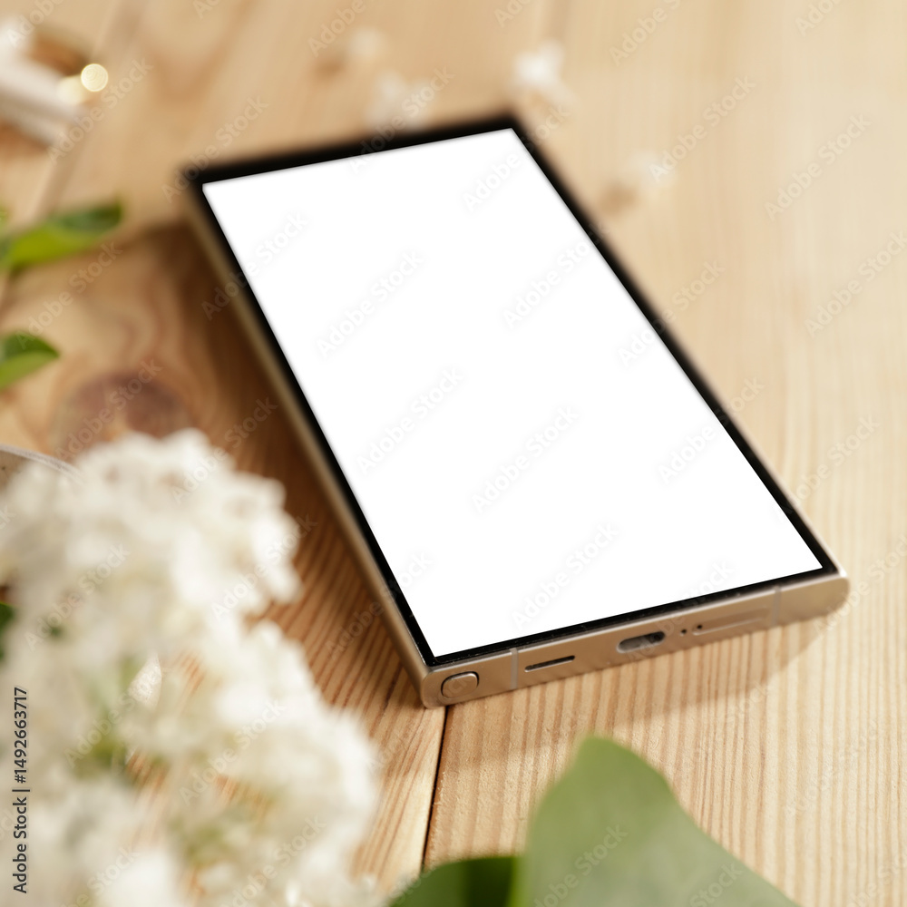 Flat lay of a smartphone on a wooden table with copy space for text or product . Perfect for fashion, cosmetics, lifestyle project designs or product placement themes in natural light.