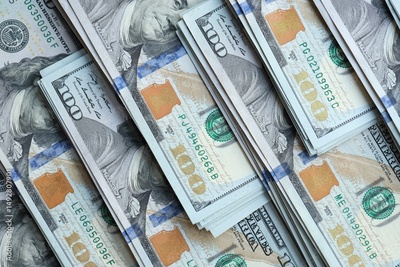 Background of US dollar bills. View from above. American new money cash, hundred dollar bills