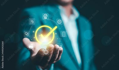 Hand shows sign of top service Quality assurance, Guarantee, Standards, ISO certification and standardization concept, satisfaction, service experience, show the standards of products and services.