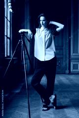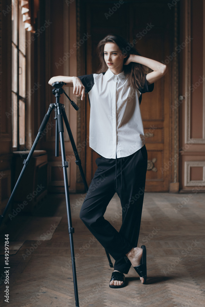 Beautiful slim model in black and white shirt and trousers holding her hair iposing next to a camera tripod in long theatre corridor. Brunette pensive girl in classic interior. Campaign backstage