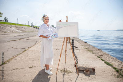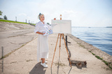 Female artist paints a cityscape in Samara