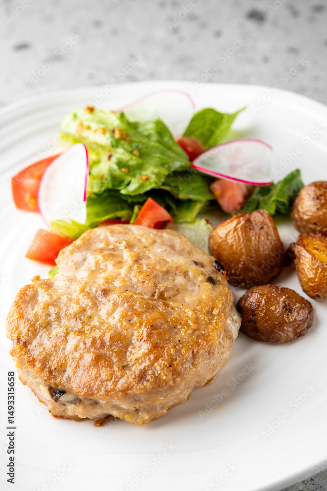 A white plate with a meal consisting of a cooked patty, roasted potatoes, and a fresh salad with lettuce, tomatoes, and radish slices, presented on a speckled gray surface.