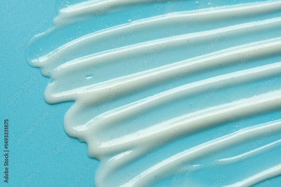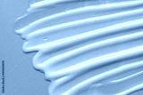 Skincare cosmetic product smears texture on blue background close up. Beauty abstract