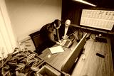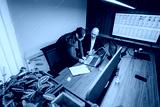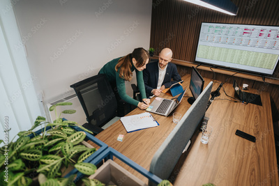 Two associates discuss and evaluate business strategies at a desk using laptops and charts, fostering collaboration, insight sharing, and teamwork in a well-equipped and organized workspace.