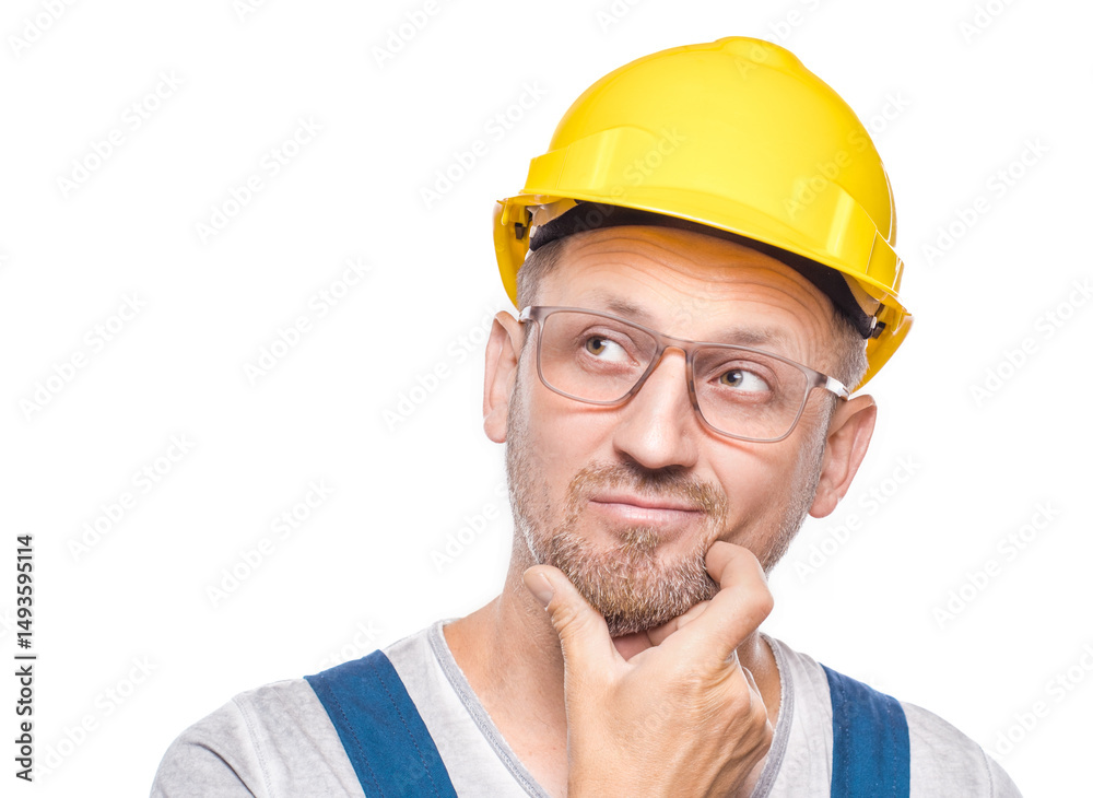 Smiling construction worker thinking and looking up to thought bubble. Closeup portrait of pensive construction worker with smile face expression, copy space for text, isolated on white background