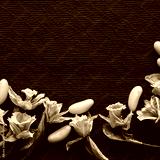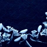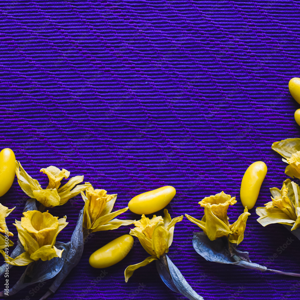Close-up dry yellow daffodils with yellow candy beans dragee on purple background with empty space