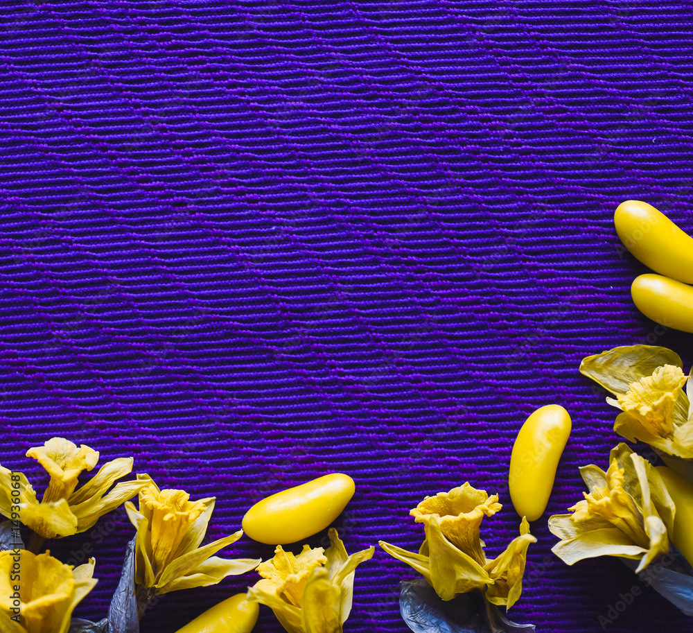 Close-up dry yellow daffodils with yellow candy beans dragee on purple background with empty space