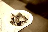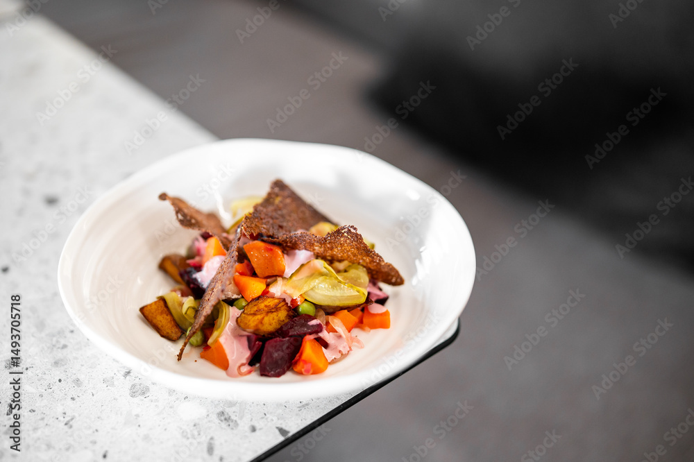 A close-up of a gourmet vegetable dish with crispy bread, served in a white bowl on a marble countertop. The colorful ingredients create a vibrant and appetizing presentation.