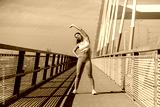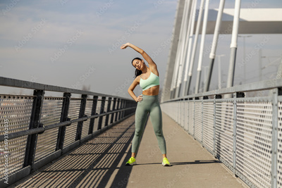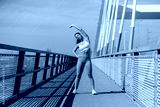 Full length of fit sportswoman standing on a bridge downtown and stretching her arm.