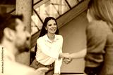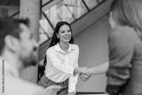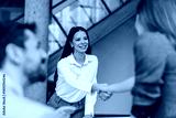 Two female executives shaking hands and closing a deal while standing in meeting room at corporate firm.