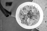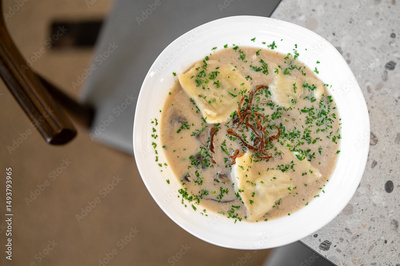 White bowl of ravioli with creamy mushroom sauce, garnished with chopped parsley and caramelized onions, placed on a speckled countertop with a wooden chair in the background.
