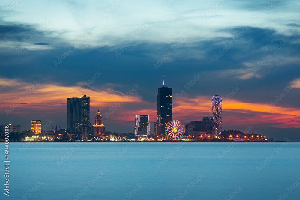 Night view of Batumi city skyline with modern buildings and a colorful illuminated ferris wheel.
