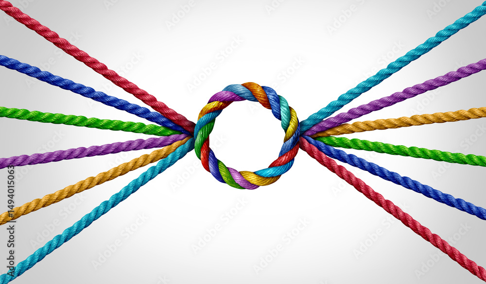 Unity Success Concept Connecting together in a perfect circle as a teamwork symbol or a business success metaphor for joining a partnership of diversity as diverse ropes connected.