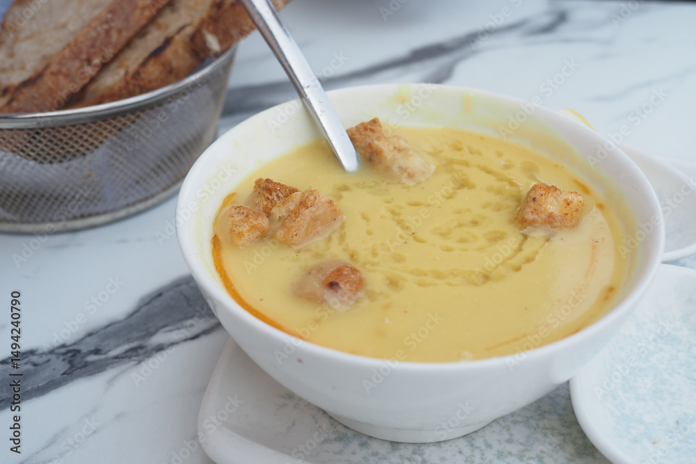 Delicious bowl of soup served with crusty bread
