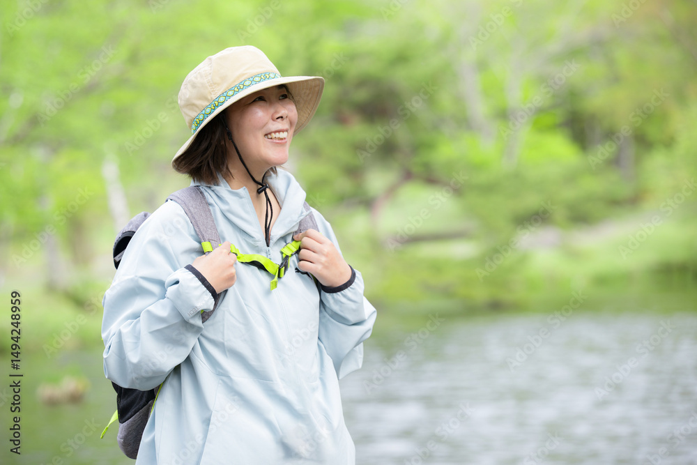 登山やトレッキングをする人 湖や景色を眺める中年の女性