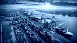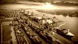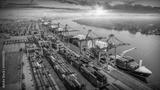 Logistics and transportation of Container Cargo ship and Cargo plane with working crane bridge in shipyard at sunrise, logistic import export and transport industry background