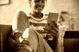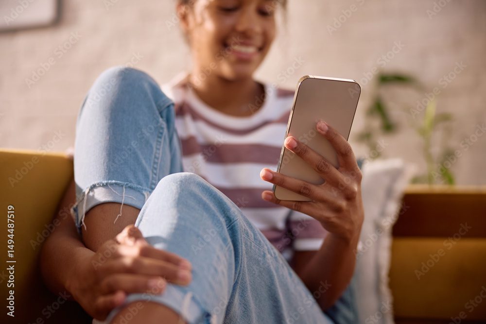 Close up of African American girl using mobile phone at home.