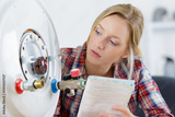 female trainee plumber working on central heating boiler
